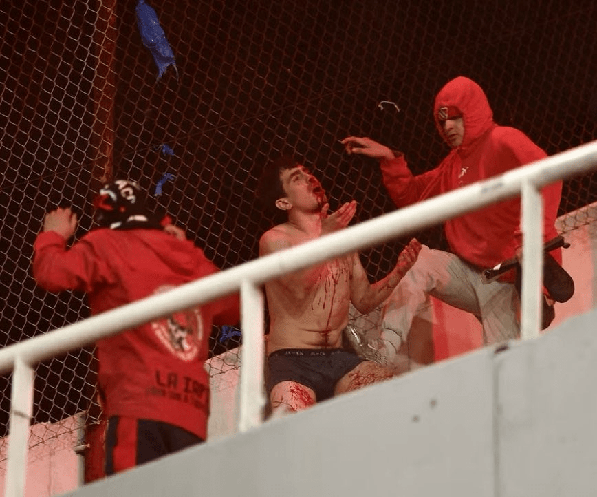 Este sector golpeó con palos y desnudó a los aficionados visitantes. Un hombre fue arrojado al vacío desde la grada después de que, aparentemente, otro le empujase con un elemento. Otro hombre, suplicando que no le agredieran más, se desmayó tras recibir un certero golpe en la cabeza. La imagen final de toda esa concatenación de violencia fue la de un carrusel de ensangrentados y varios cuerpos inertes abandonados en la grada.